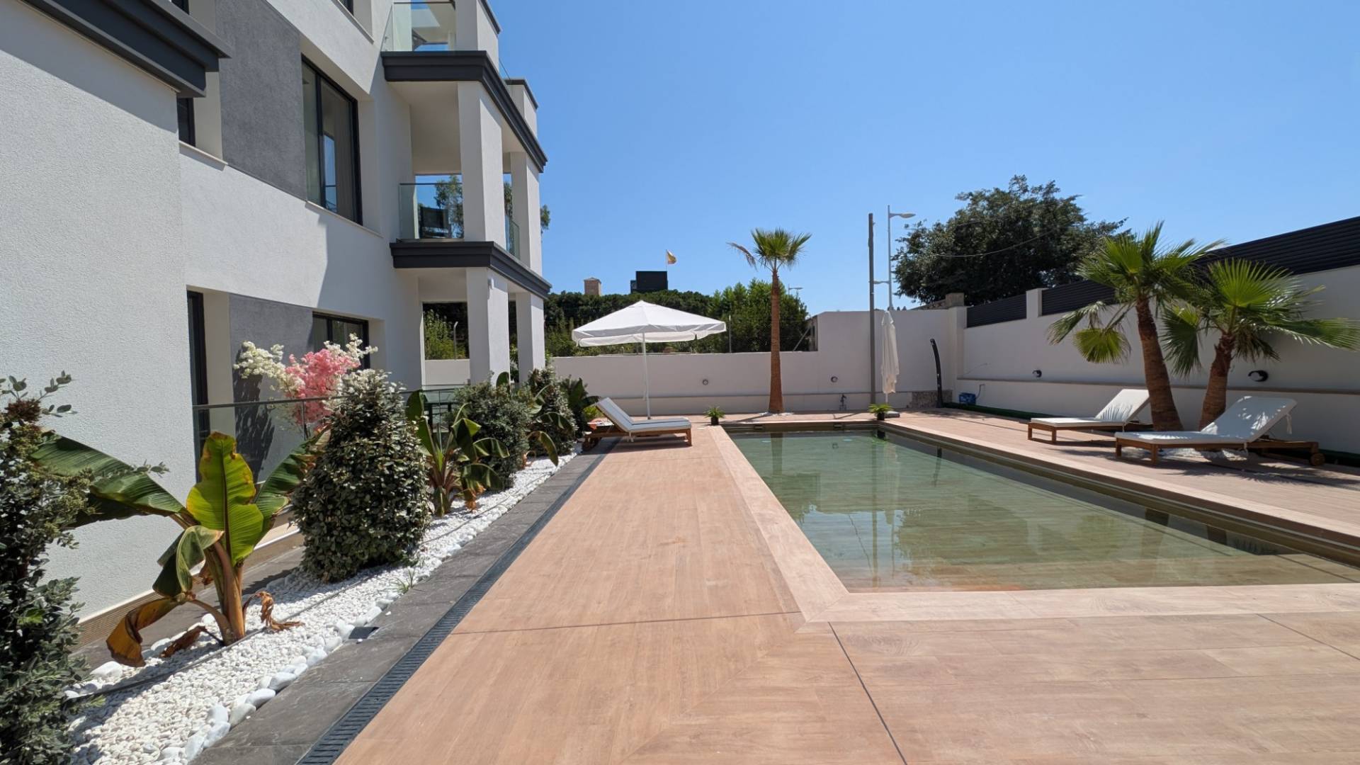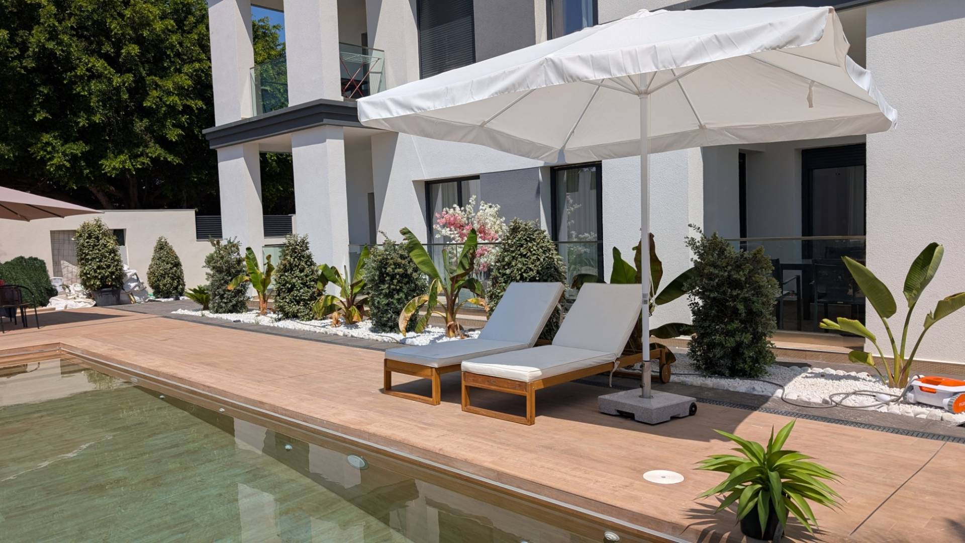 Modernt poolområde, perfekt integrerat i omgivningen, idealiskt för att njuta av Medelhavssolen.